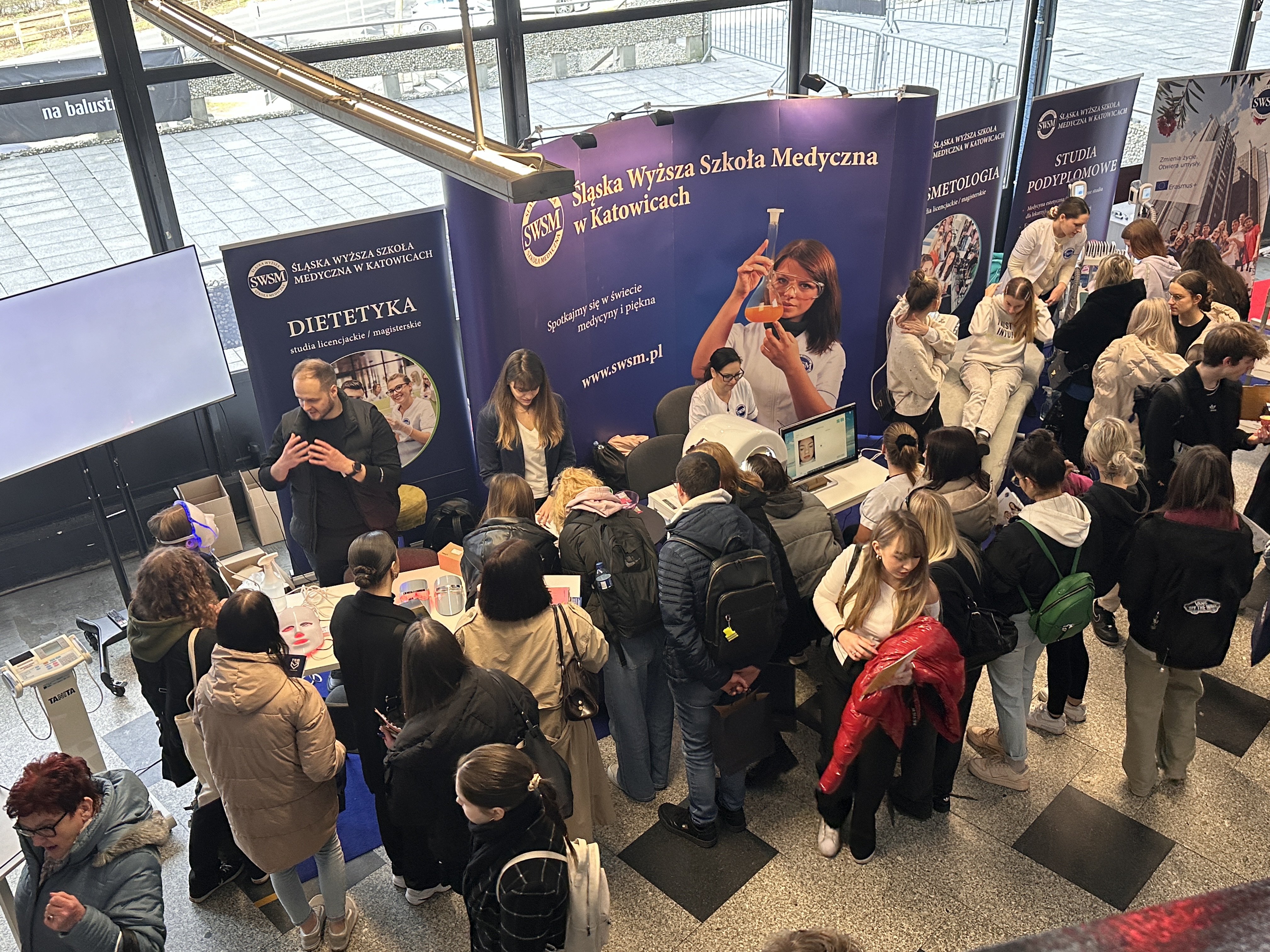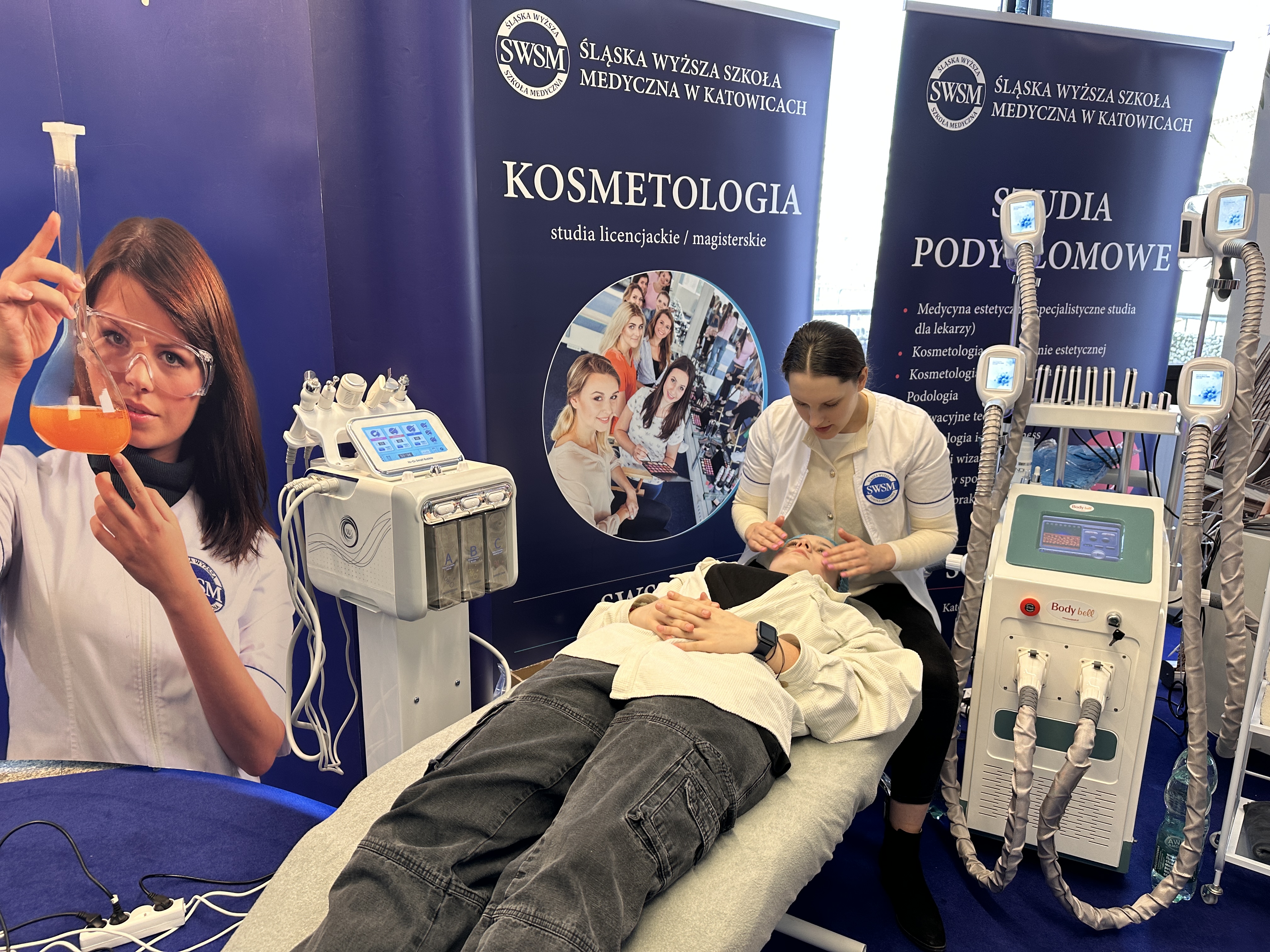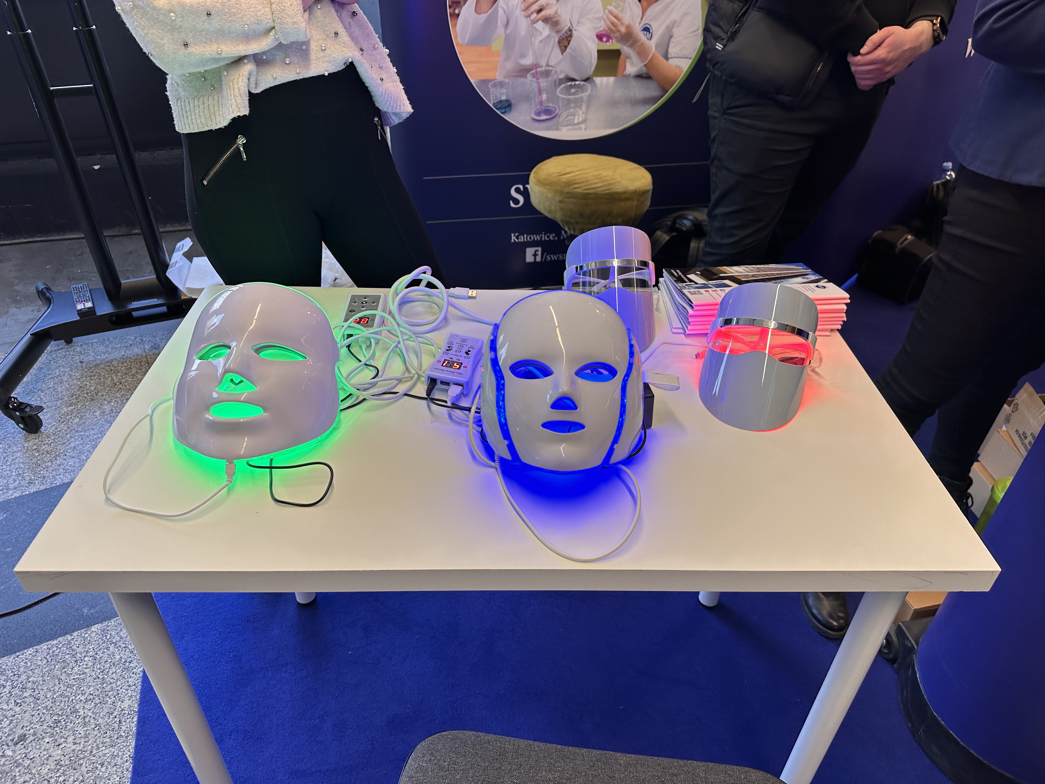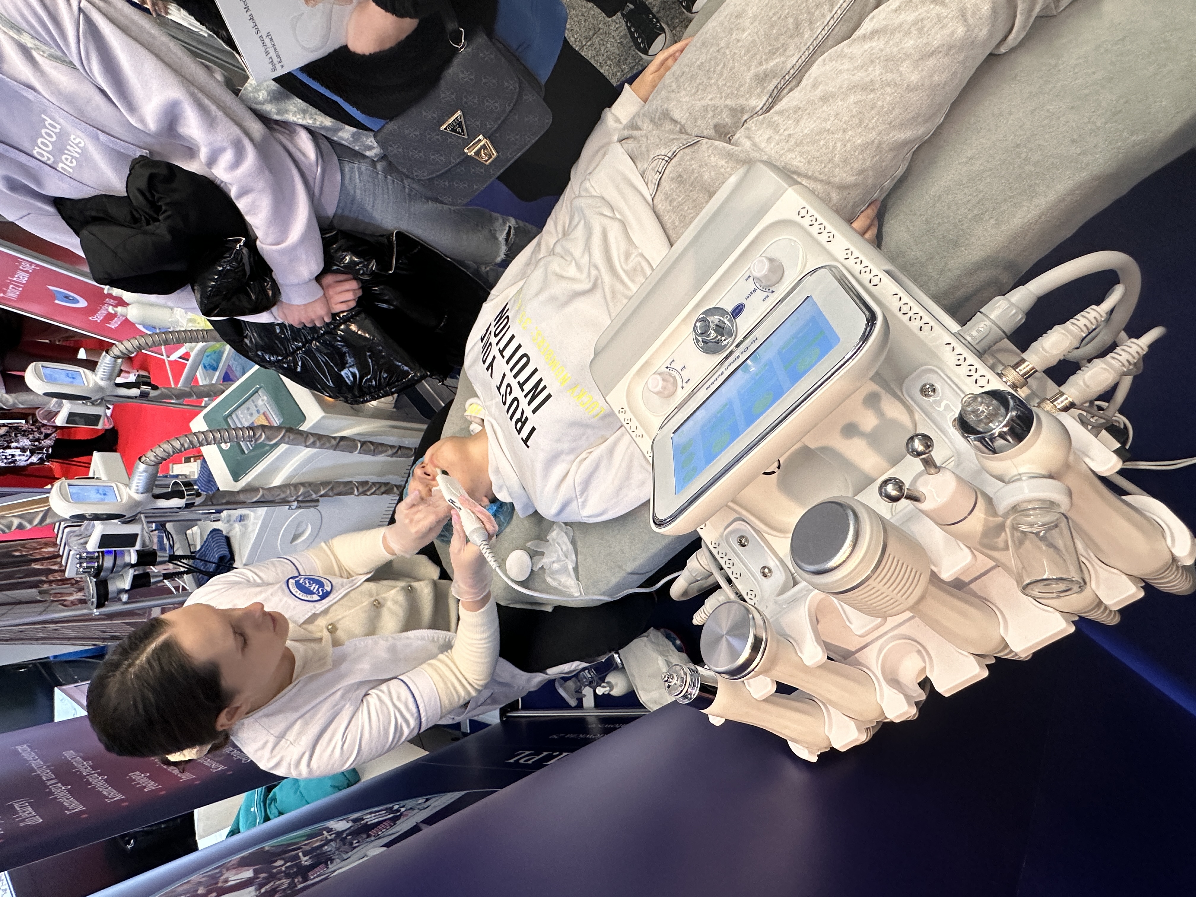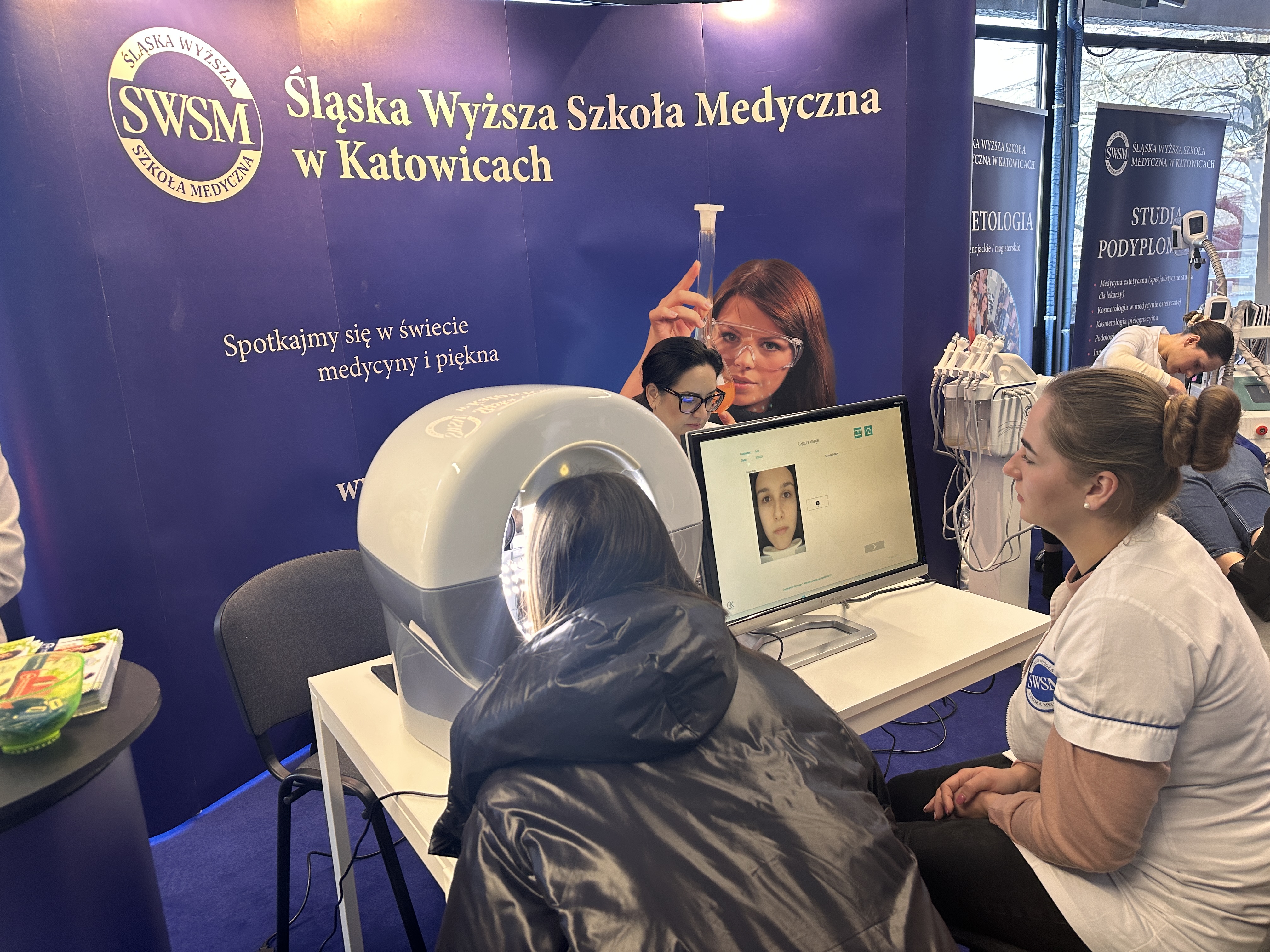 Nasze stanowisko składało się z trzech sekcji — zabiegowej, diagnostyki oraz dietetyki. W ich skład wchodziły m.in. stanowisko z maskami led, VisioFace RD do badania stanu skóry twarzy, urządzenie do badania składu ciała oraz profesjonalne zabiegi z oczyszczaniem wodorowym.