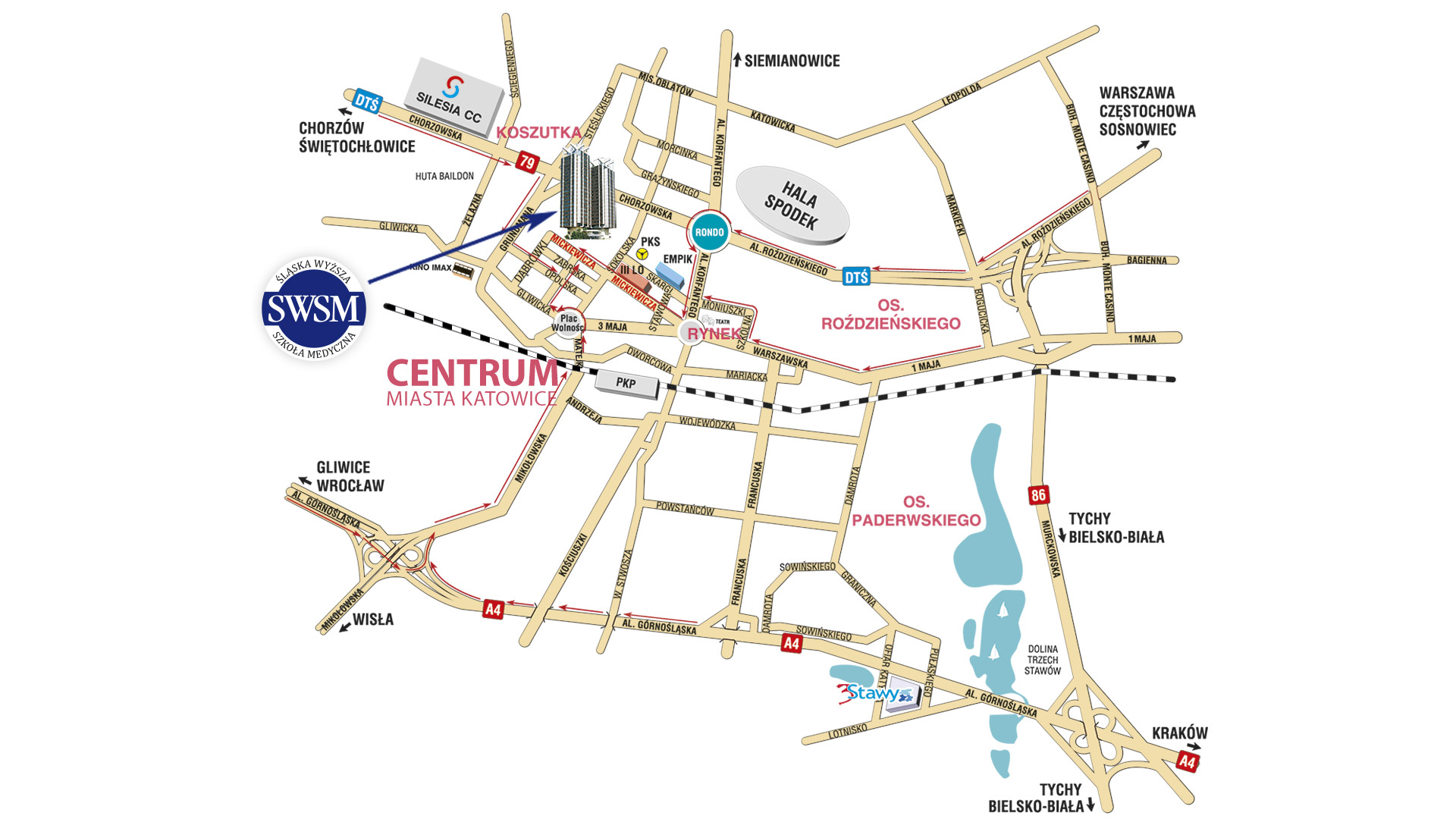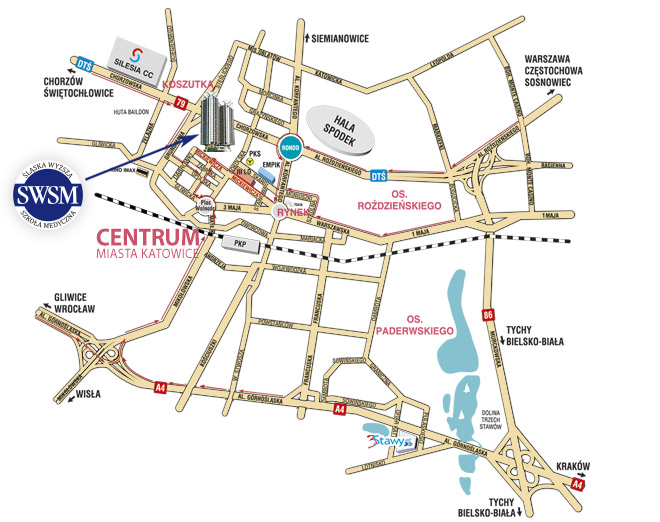 Mickiewicza 29: N 50°15.803', E 019°00.813'