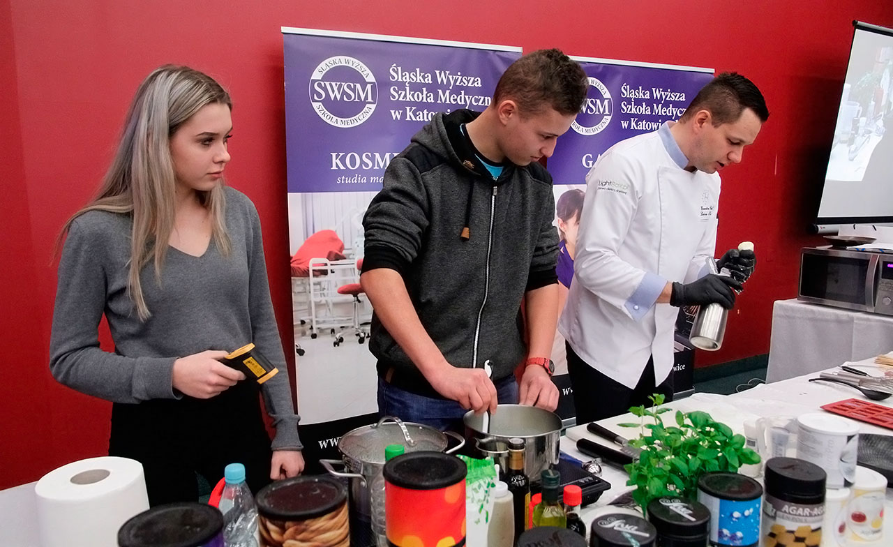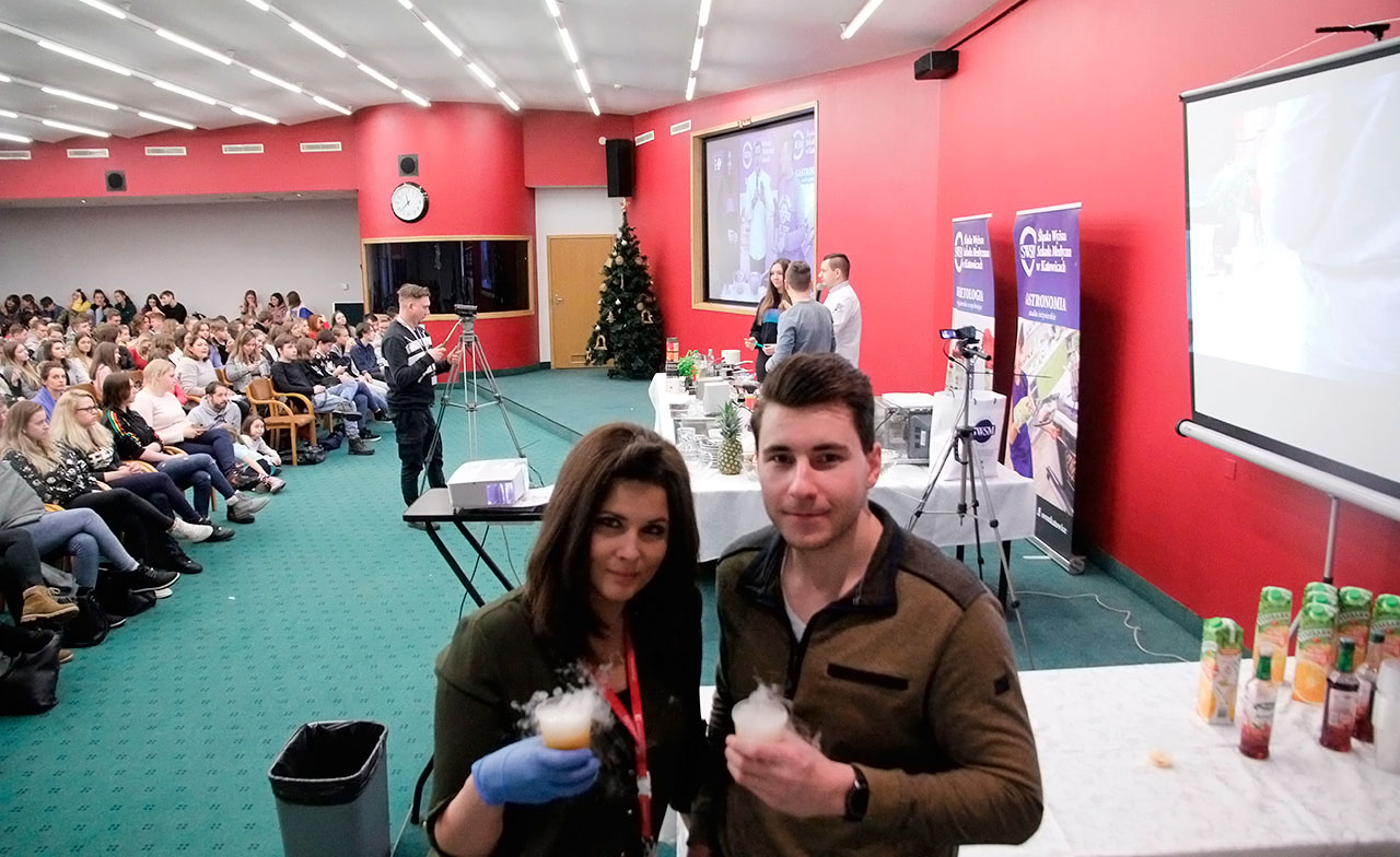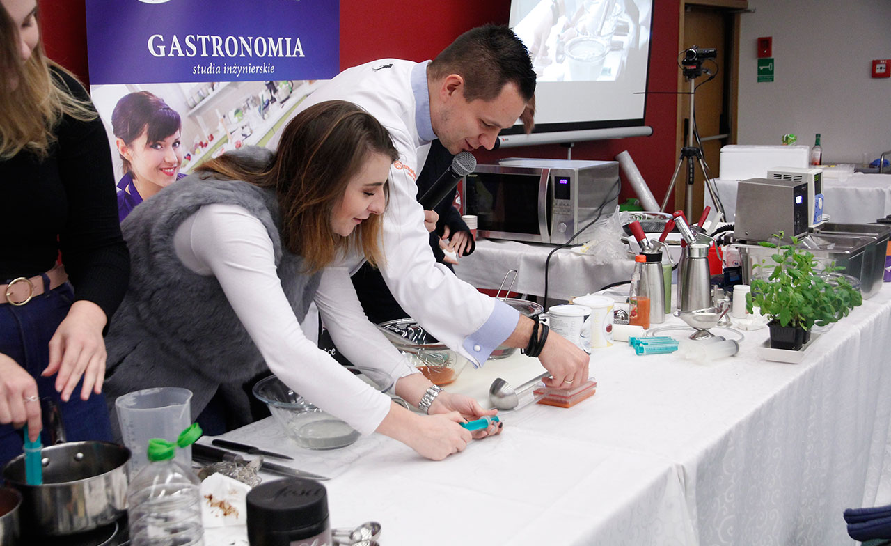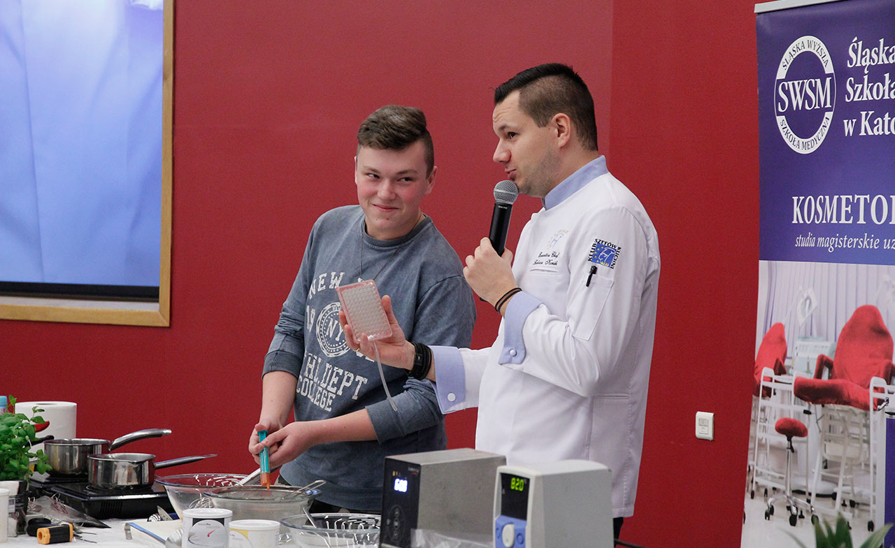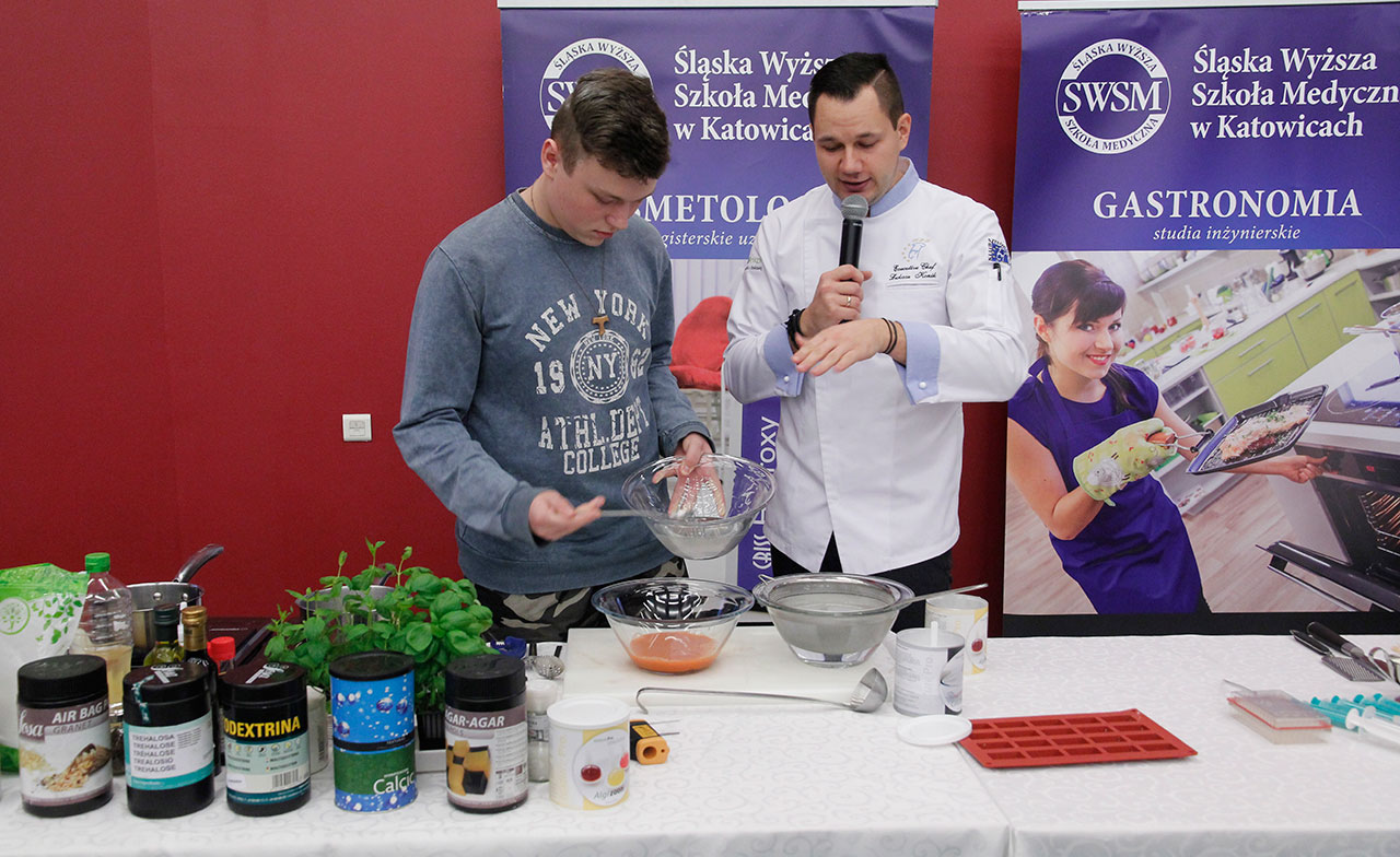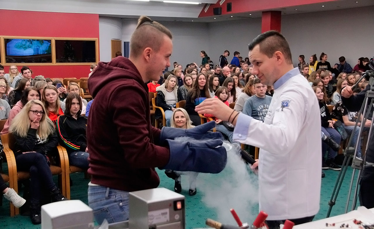 W dniach 9 i 10 stycznia 2019 gościliśmy w naszych murach pana Łukasza Konika, który poprowadził mrożący krew w żyłach (i nie tylko w nich) pokaz kuchni molekularnej. Cykliczne spotkania z panem Łukaszem cieszą się niesłabnącą popularnością i stanowią już stały punkt programu w ofercie SWSM.
