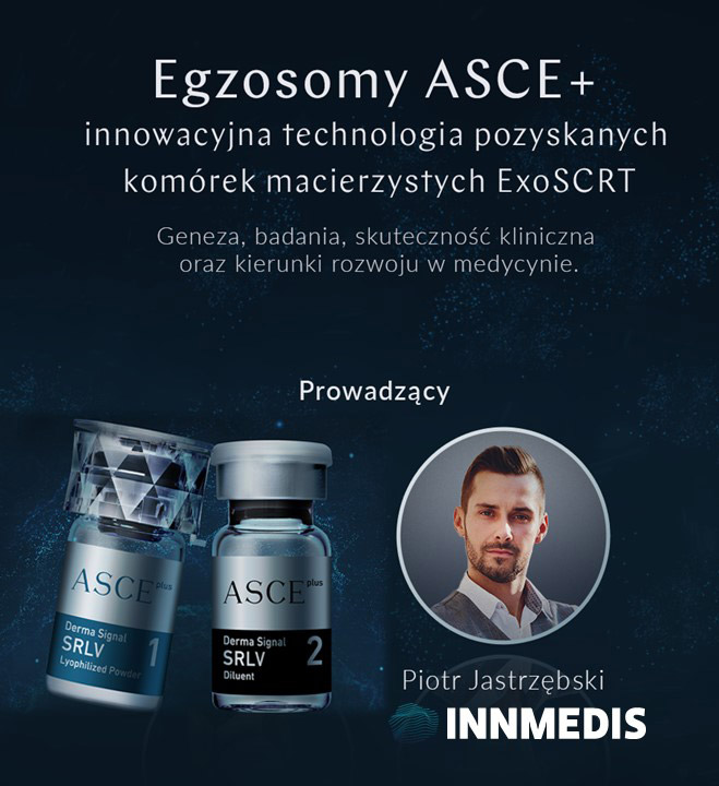 Oryginalne Egzosomy ASCE+ w opatentowanej technologii ExoSCRT™ to pierwsze w 100% czyste egzosomy dostępne na rynku, które zostały opracowane jako terapia regeneracyjna i anti-aging nowej generacji. Egzosomy ASCE+ to pęcherzyki zewnątrzkomórkowe o rozmiarach nanometrowych, które są najważniejszym mediatorem komunikacji międzykomórkowej i pełnią podwójną funkcję: regeneracji skóry oraz przeciwzapalną. Ta zaawansowana biotechnologia pozwala jednocześnie regenerować skórę, wspiera terapie łysienia oraz wycisza stany zapalne skóry. Mikroskopijna cząsteczka ASCE+ (100 nm) pozwala penetrować wszystkie warstwy skóry bez konieczności iniekcji produktu.