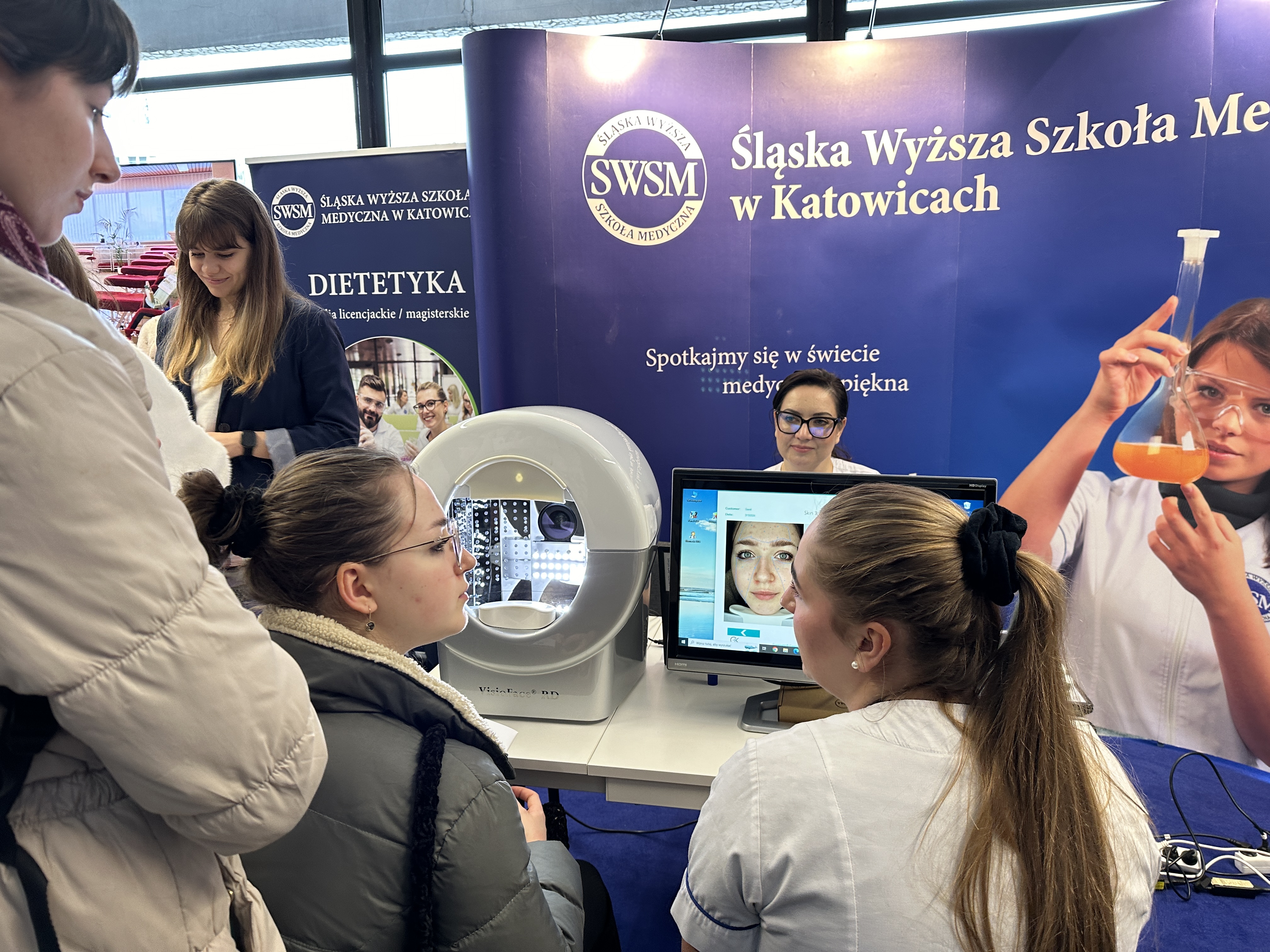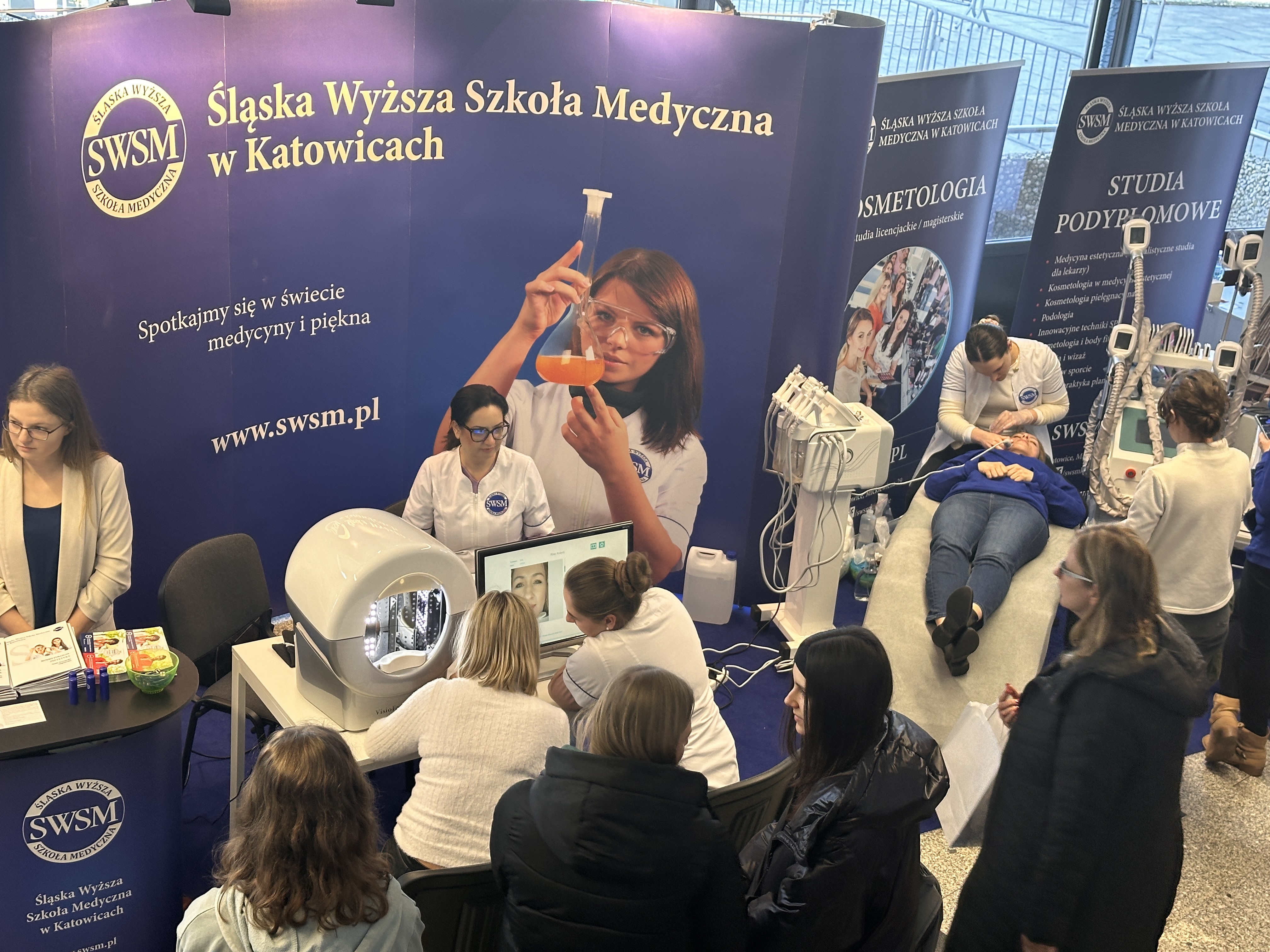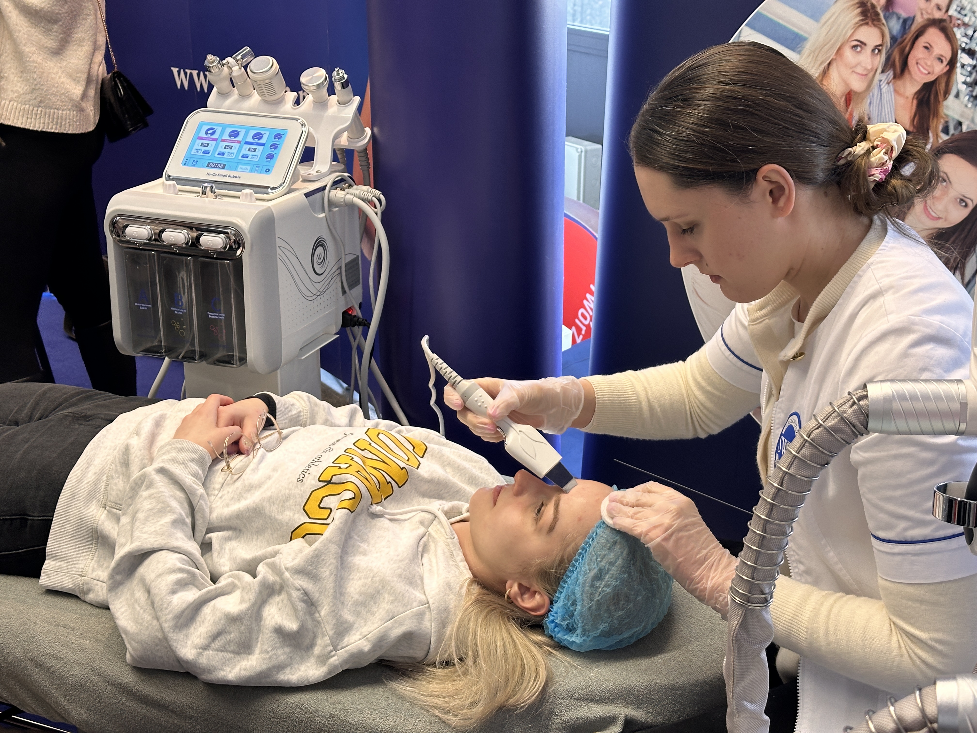 Nasze stanowisko składało się z trzech sekcji — zabiegowej, diagnostyki oraz dietetyki. W ich skład wchodziły m.in. stanowisko z maskami led, VisioFace RD do badania stanu skóry twarzy, urządzenie do badania składu ciała oraz profesjonalne zabiegi z oczyszczaniem wodorowym.