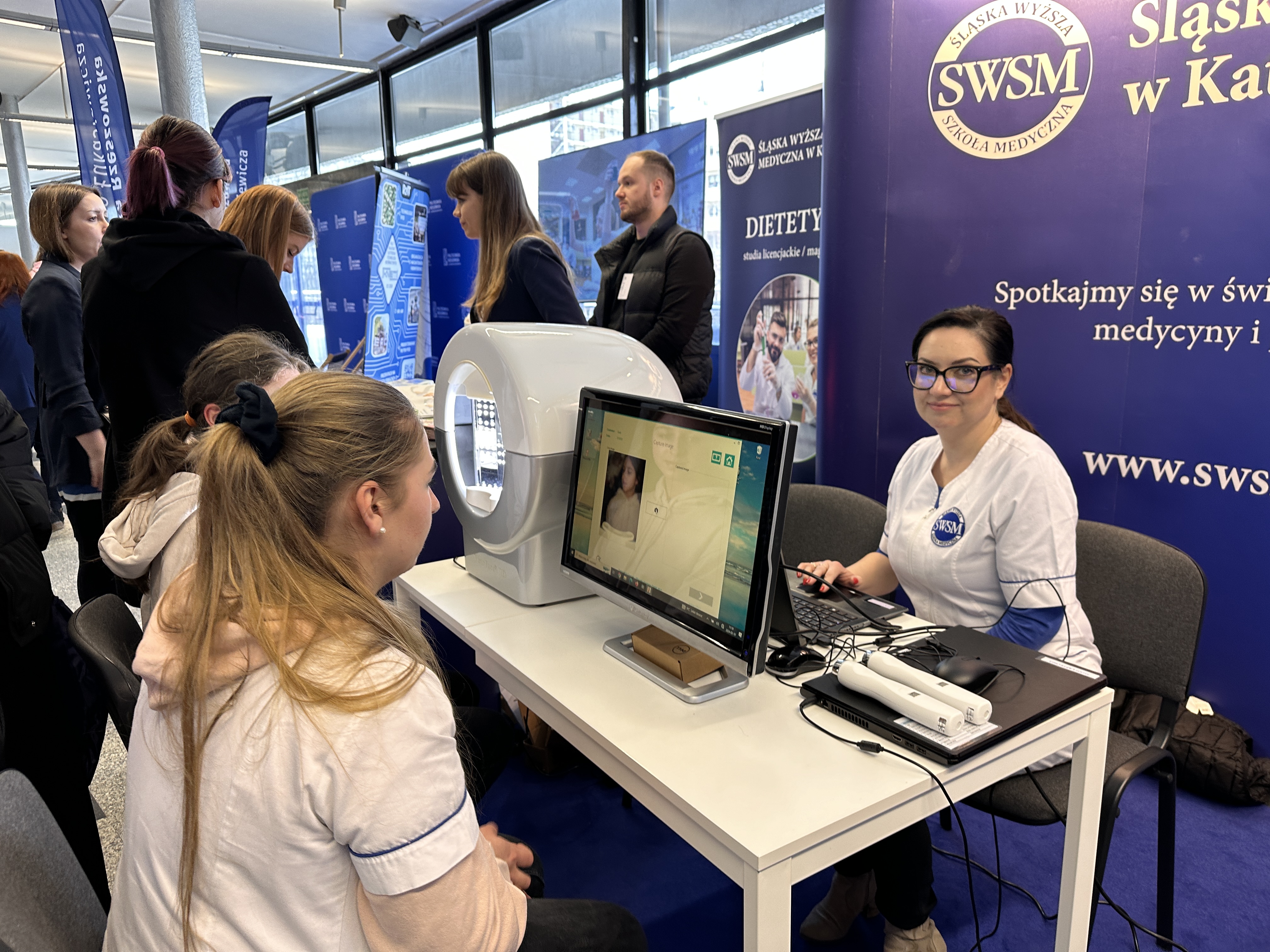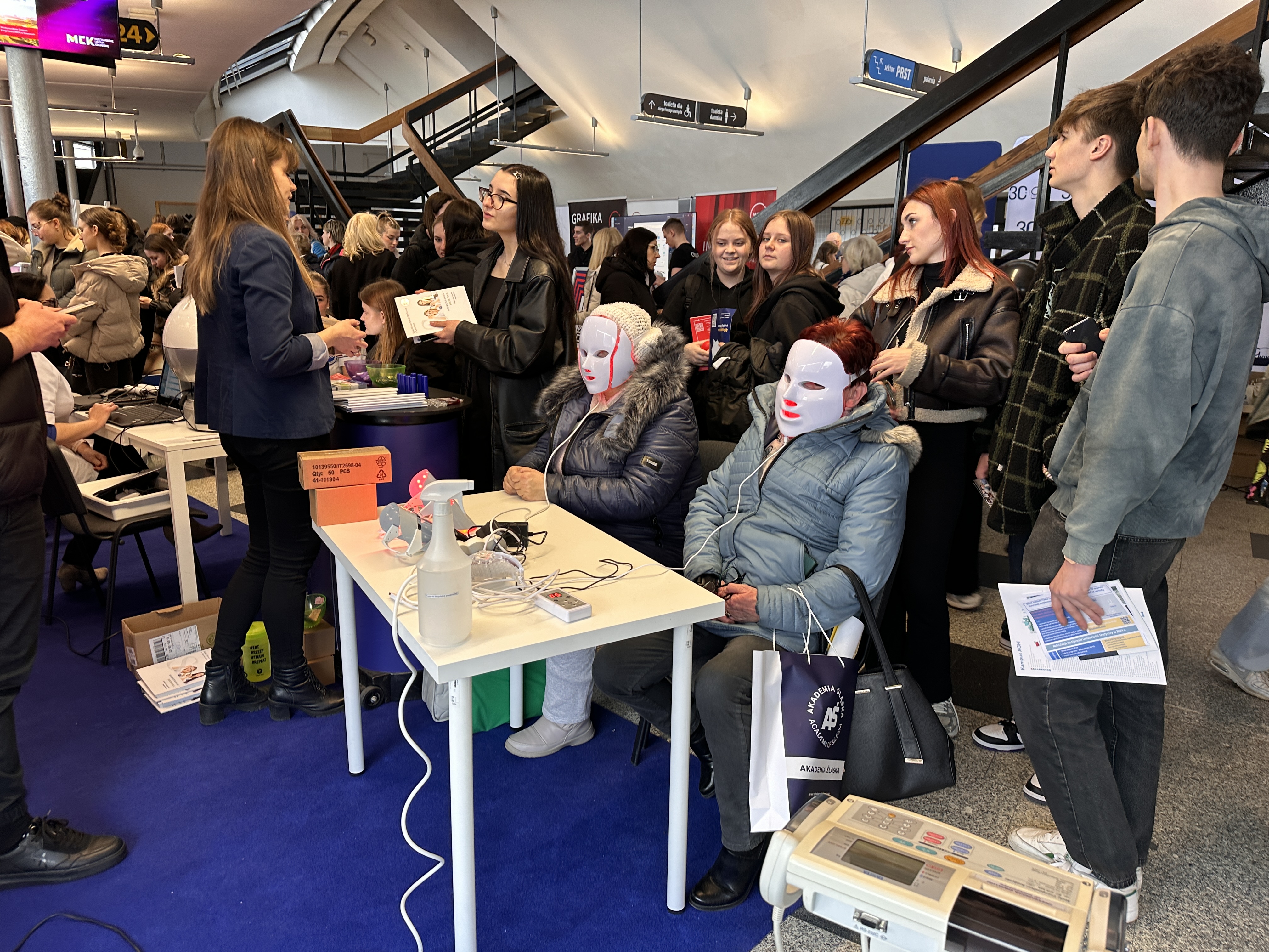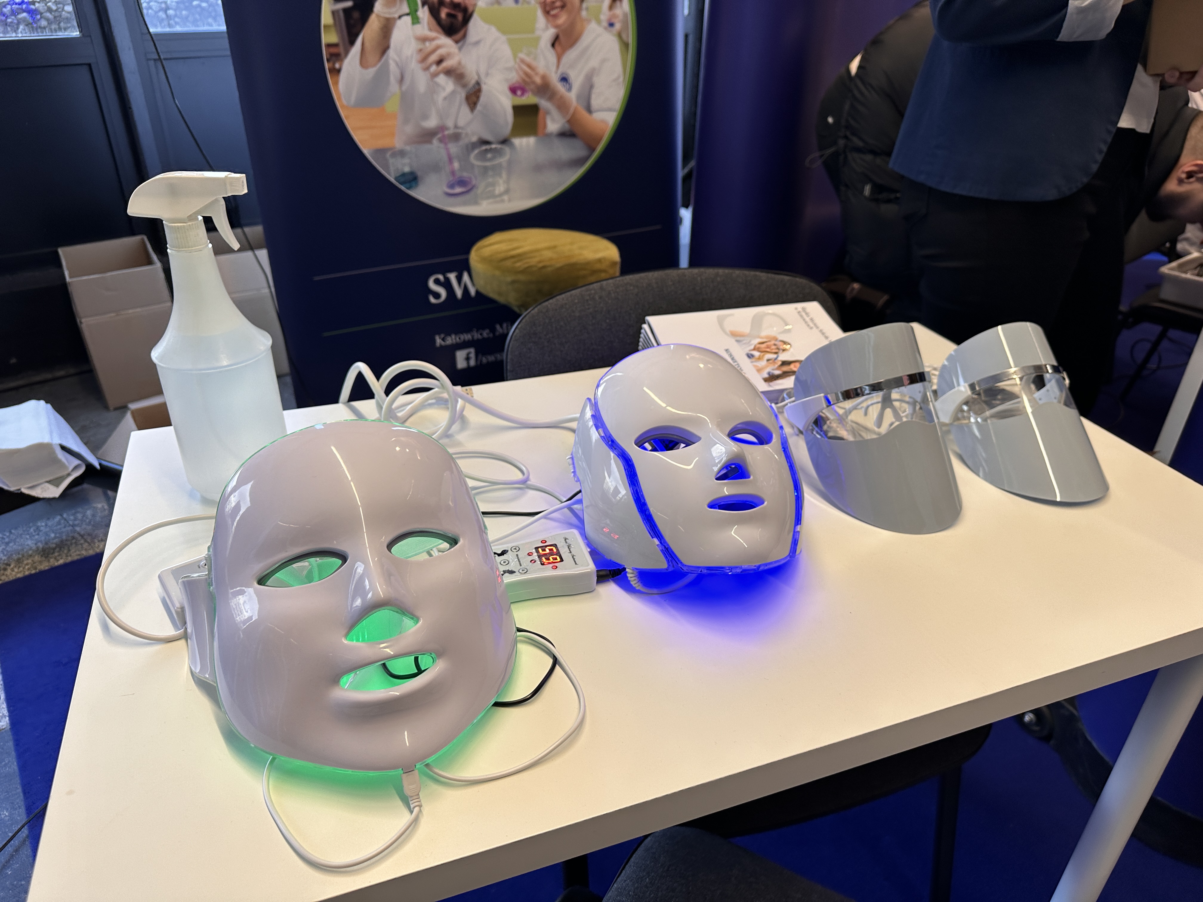 Nasze stanowisko składało się z trzech sekcji — zabiegowej, diagnostyki oraz dietetyki. W ich skład wchodziły m.in. stanowisko z maskami led, VisioFace RD do badania stanu skóry twarzy, urządzenie do badania składu ciała oraz profesjonalne zabiegi z oczyszczaniem wodorowym.