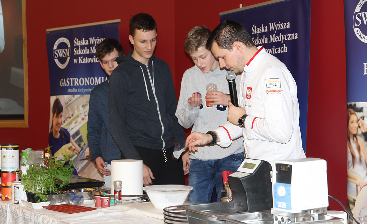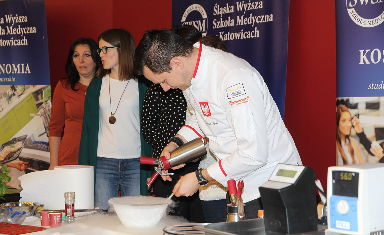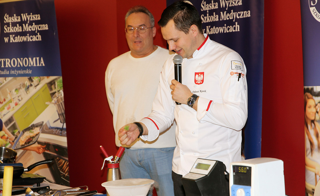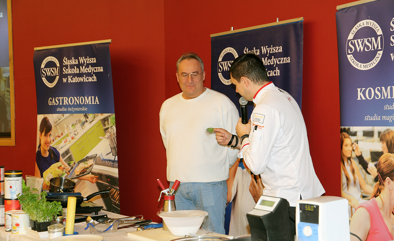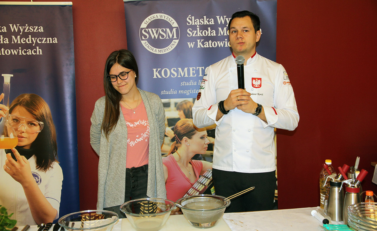 Za nami dwa pasjonujące dni spotkań kulinarnych z mistrzem Łukaszem Konikiem i jego konikiem, czyli kuchnią molekularną. Dziękujemy za tłumne przybycie oraz aktywny udział w naszym pokazie. To była wyjątkowo aktywna i zdolna publiczność!!! Mamy nadzieję, że udało nam się zafascynować Was zagadnieniami ze świata gastronomii i dietetyki jakich wcześniej nie doświadczyliście w swoim życiu. Chcecie więcej? Zapraszamy na studia do Śląskiej Wyższej Szkoły Medycznej w Katowicach.