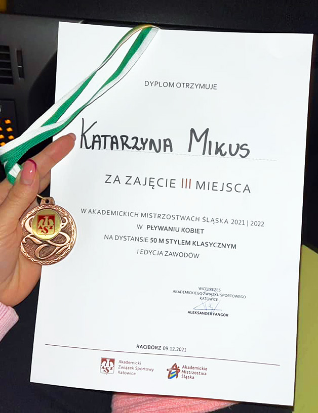 Katarzyna Mikus wywalczyła brązowy medal w Akademickich Mistrzostwach Śląska 2021/2022 w pływaniu kobiet na dystansie 50m stylem klasycznym. Wystartowała także na dystansie 50m stylem motylkowym, w którym to wyścigu zajęła 5 miejsce.